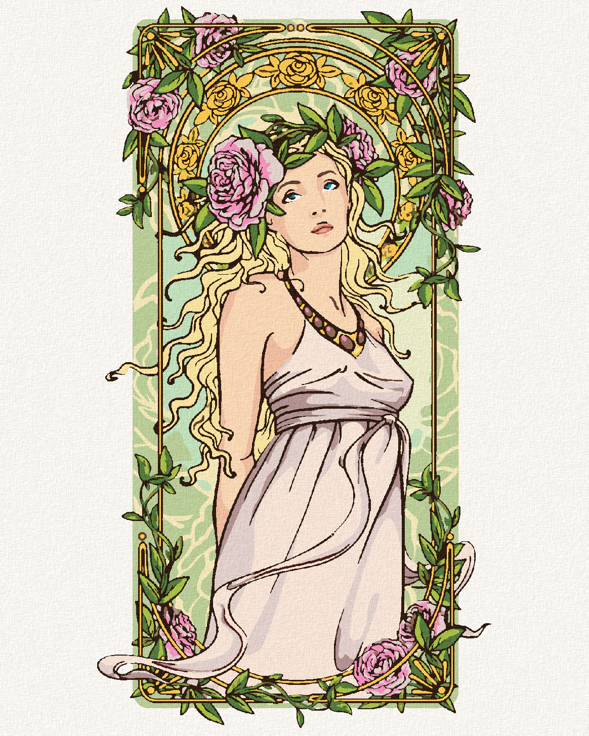 Malování podle čísel - REPRODUKCE ŽENA V ŠATECH A RŮŽE (A. MUCHA) - 40x50 cm, vypnuté plátno na rám
