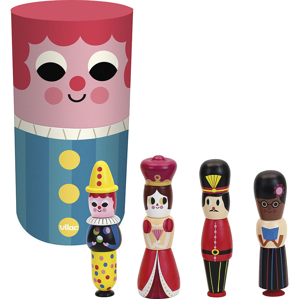 Klaun, královna, voják a lady s knihou... a pokud vše pomícháme, dostaneme vojáka se sukní a královnu v kalhotech klauna? Čtyři magnetické dřevěné figurky, které můžete mixovat a vytvářet tak vlastní zábavné kombinace. Navrženo Ingelou P. Arrhenius. Hračky Vilac mají značku francouzské agentury...