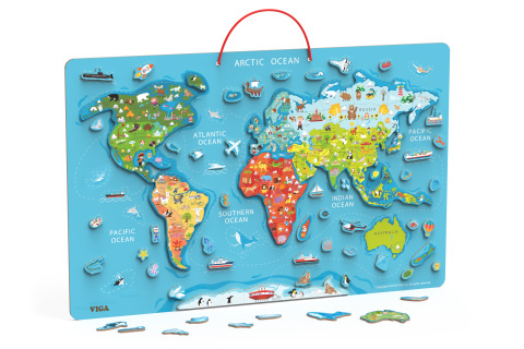 Dřevěná mapa světa s tabulí. Mapa obsahuje mnoho magnetický dílků. Hraj si a poznávej všechny kouty světa. Druhá strana mapy slouží jako tabule na kreslení a psaní. Rozměry cca 72 x 46 x 0,7 cm. Věk 3+ prečítať celé