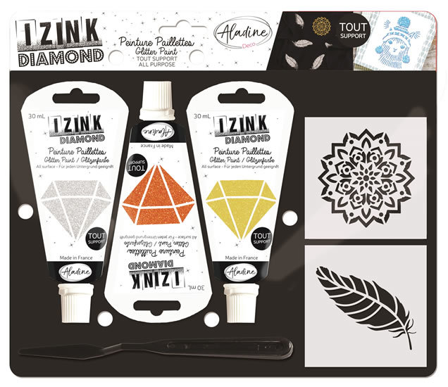 Kreativní sada s diamantovými barvami. Vyjímečně třpytivé barvy se nanáší špachtlí přes šablonu. Jsou vhodné na papír, textil, kov, i plast: jsou ideální k dekoraci přáníček, deníků, triček, tenisek, kšiltovek, ale i penálků a dalších předmětů. Sada obsahuje 3 ks barev, 2 šablony a špachtli.
