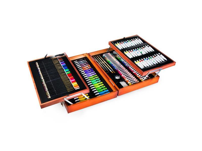 Táto kompletná výtvarná súprava ponúka širokú škálu farebných nástrojov a pomôcok - od vodových farieb, pasteliek a voskových pastelov až po fixky a štetce. Všetky komponenty sú starostlivo vybraté tak, aby podporovali kreativitu a uľahčili maliarske aj kresliarske projekty. Navyše sú všetky pomôcky uložené v praktickom a elegantnom drevenom kufríku, ktorý zjednodušuje prenášanie a udržiavanie poriadku.