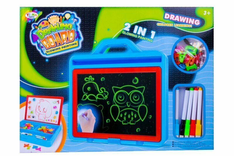 Tablica 2w1 malowanie światłem 1006015 1x tablica dwustronna, 5x mazak, 1x długopis, 26x literki z magnesem, 26x cyferki z magnesem,