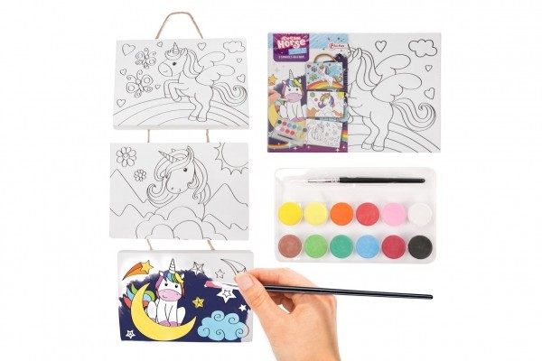 Mini plátno na provázku jednorožec 3ks 18x13cm se štětcem s barvami ve fólii