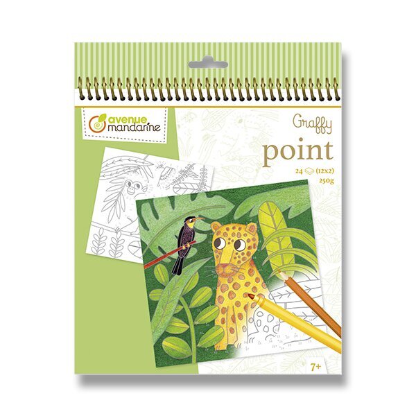 Omalovánky Avenue Mandarine Graffy Point s motivy zvířátek z džungle určené k vybarvení pomocí spojování čísel. Stačí spojovat čísla jedno po druhém až se objeví kresba a potom začít vybarvovat. Omalovánky pro 2 věkové skupiny ve 2 úrovních obtížnosti. Omalovánky obsahují 24 listů, 12 motivů po 2 ks. Gramáž 250 g. Lze použít na všechny techniky - pastelky, fixy, akvarel atd.
