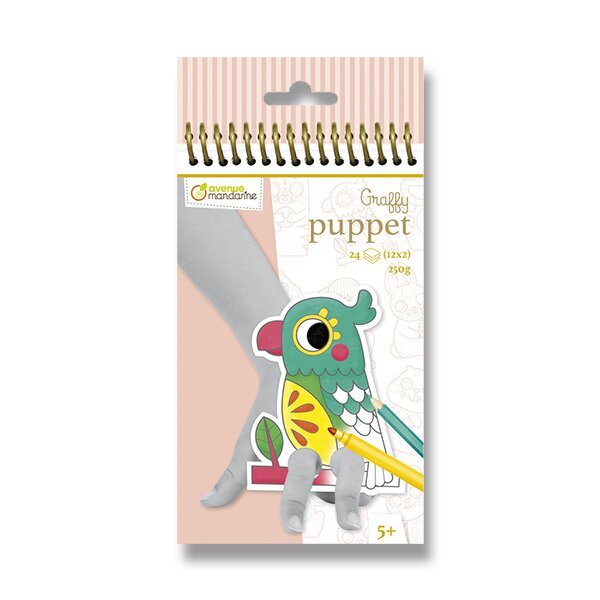 Omalovánky Avenue Mandarine Graffy Puppet s motivy domácích zvířátek. Omalovánky předem připravené a upravené pro následné použití jako prstové loutky, stačí je vybarvit a hrát si. Omalovánky obsahují 24 listů, 12 motivů po 2 ks, kroužková vazba. Lze použít na techniky: pastelky, fixy, akvarel...