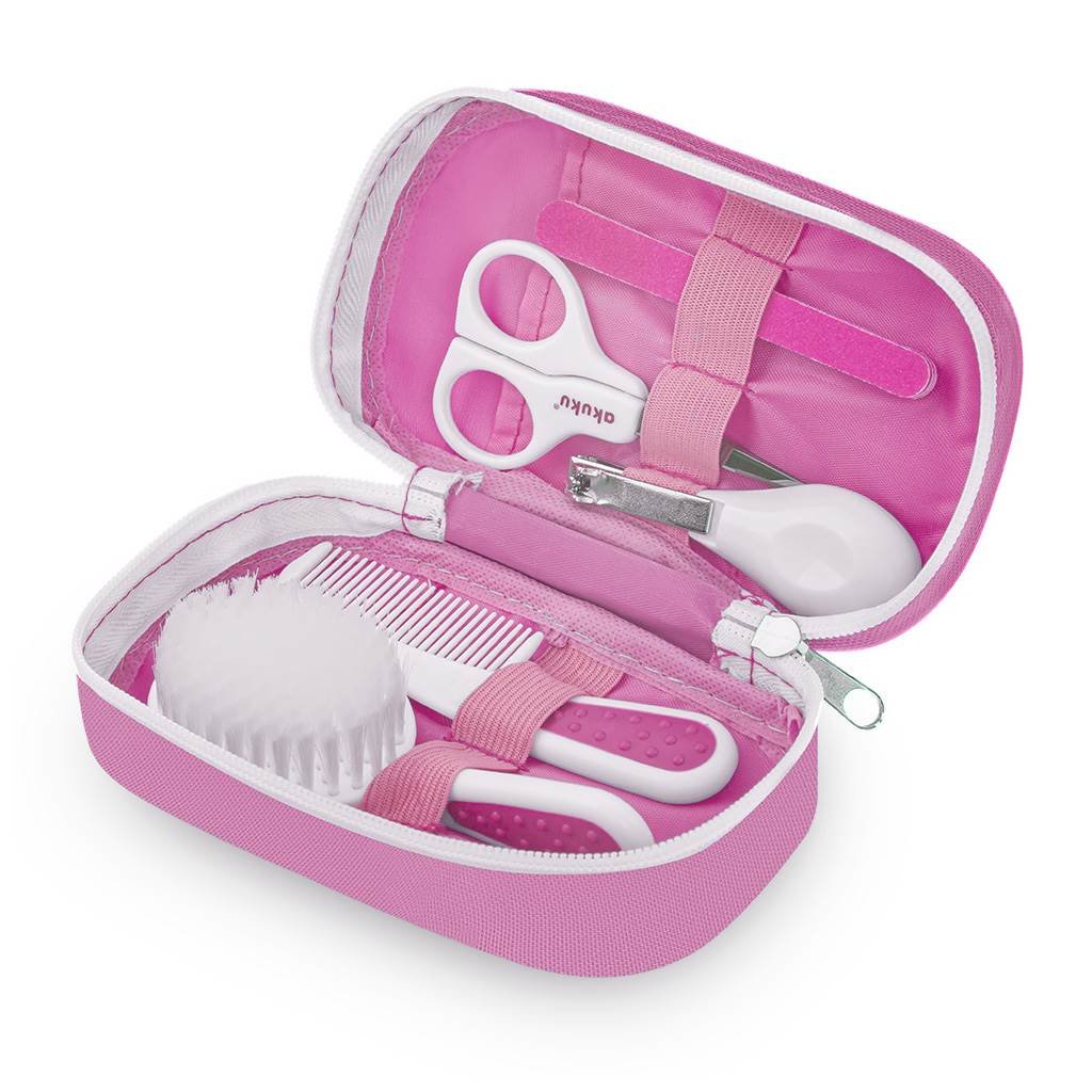 Dětská sada na manikúru Akuku, která umožňuje bezpečnou péči o dětské nehtíky. Sada obsahuje nůžky, kartáček a hřeben na vlasy, kleštičky a čtyři pilníky na nehty. Pilník vyhladí případné nerovnosti a zabrání se případnému poškrábání. Zaoblené tvary nůžek snižují riziko poranění dítěte a kleštičky nehty zkrátí. Celá manikúra je v krásném textilním pouzdře. Vhodné pro děti od narození.
