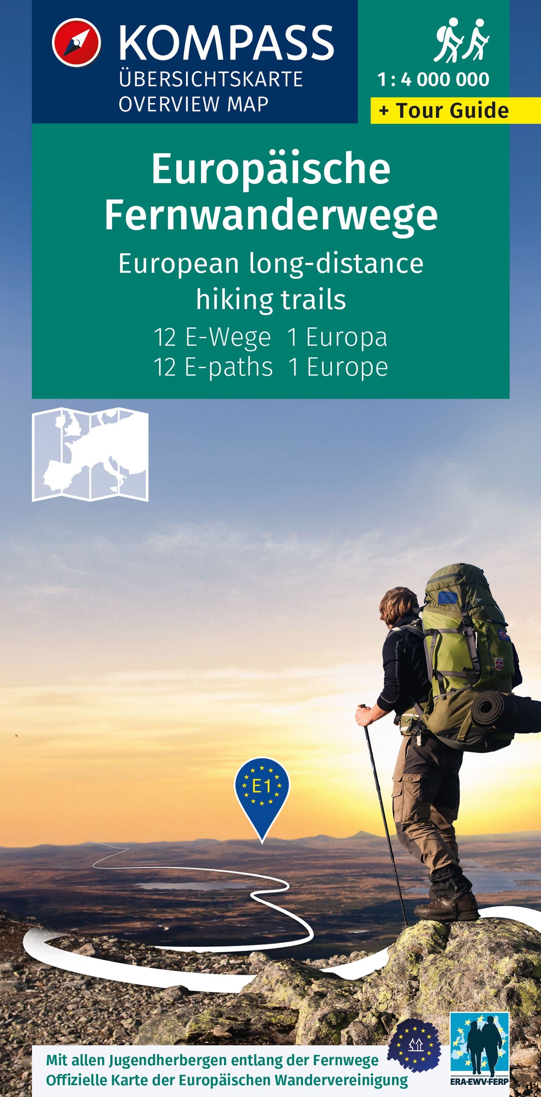 KOMPASS Fernwegekarte Europäische Fernwanderwege, 12 E-Wege - 1 Kontinent 1:4 Mio. (německy)