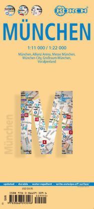 München Innenstadt 1:11 000, München 1:22 000, München Großraum 1:130 000, die Messe München 1:22 000, die Allianz Arena 1:22 000, das Voralpenland 1:850 000, eine Nahverkehrskarte des Münchener Verkehrsverbunds, die 30 Top Sehenswürdigkeiten Münchens, eine administrative Übersichtskarte...