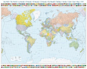 Die folienkaschierte Wandkarte zeigt die Staaten in farblicher Unterteilung. Die Flaggen oben und unten sind ergänzt mit den Staatsnamen in Deutsch und in der Landessprache. Darüber hinaus beinhaltet die Karte eine Geländeschummerung, eine Vielzahl von Orten sowie die Fernverkehrsstraßen. Format: ca. 138 x 98 cm Maßstab 1 : 32 Mio.