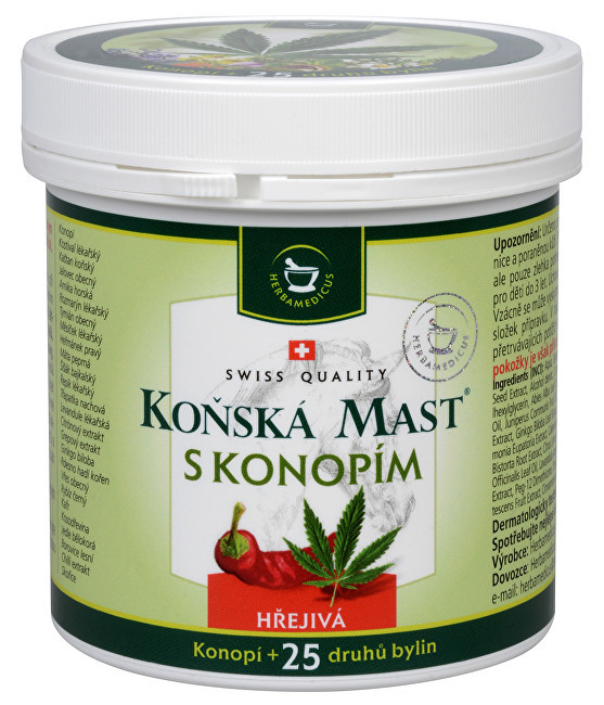 Hrejivá konská masť s konopným extraktom je vyrobená podľa tradičnej receptúry, ktorá kombinuje silu 25 druhov bylín a rastlín. Vďaka hrejivému efektu podporuje rýchlejšiu regeneráciu a zmierňuje únavu a bolesť svalov i kĺbov. Je ideálnou voľbou pre aktívnych jedincov, športovcov, ale aj pre tých, ktorí hľadajú prírodnú podporu pri bolestiach pohybového aparátu.
