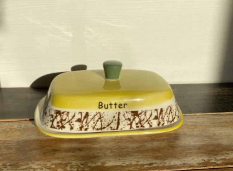 Keramická máslenka s motivem cukrárny. Rozměry - spodní část - 18,5x14cm, vrchní část - 15,5x10,5cm, výška 9,5cm. prečítať celé
