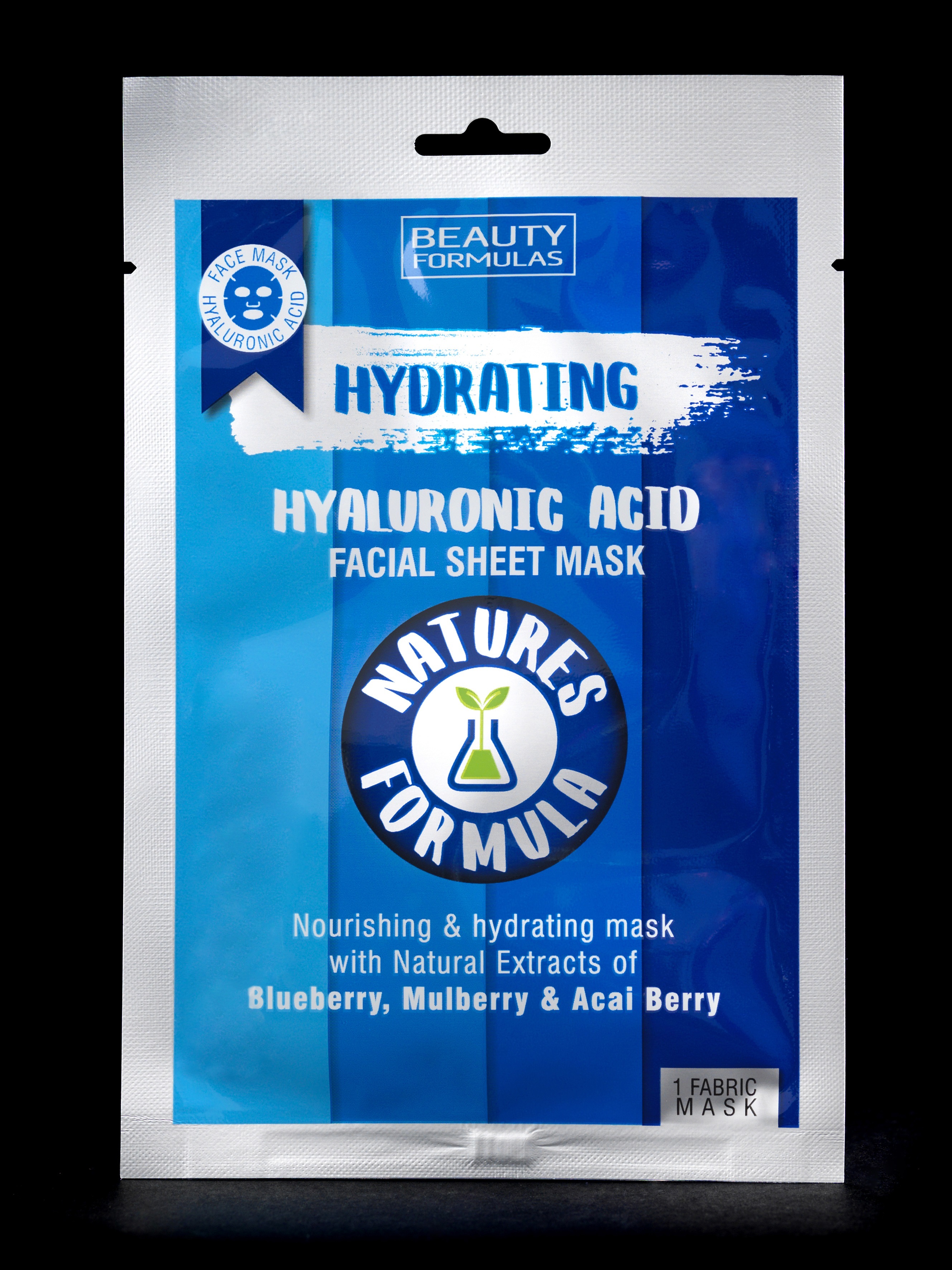 Hydratační pleťová maska Beauty Formulas Hydrating facial sheet mask s přidanou kyselinou hyaluronovou pro intenzivní hydrataci pokožky.