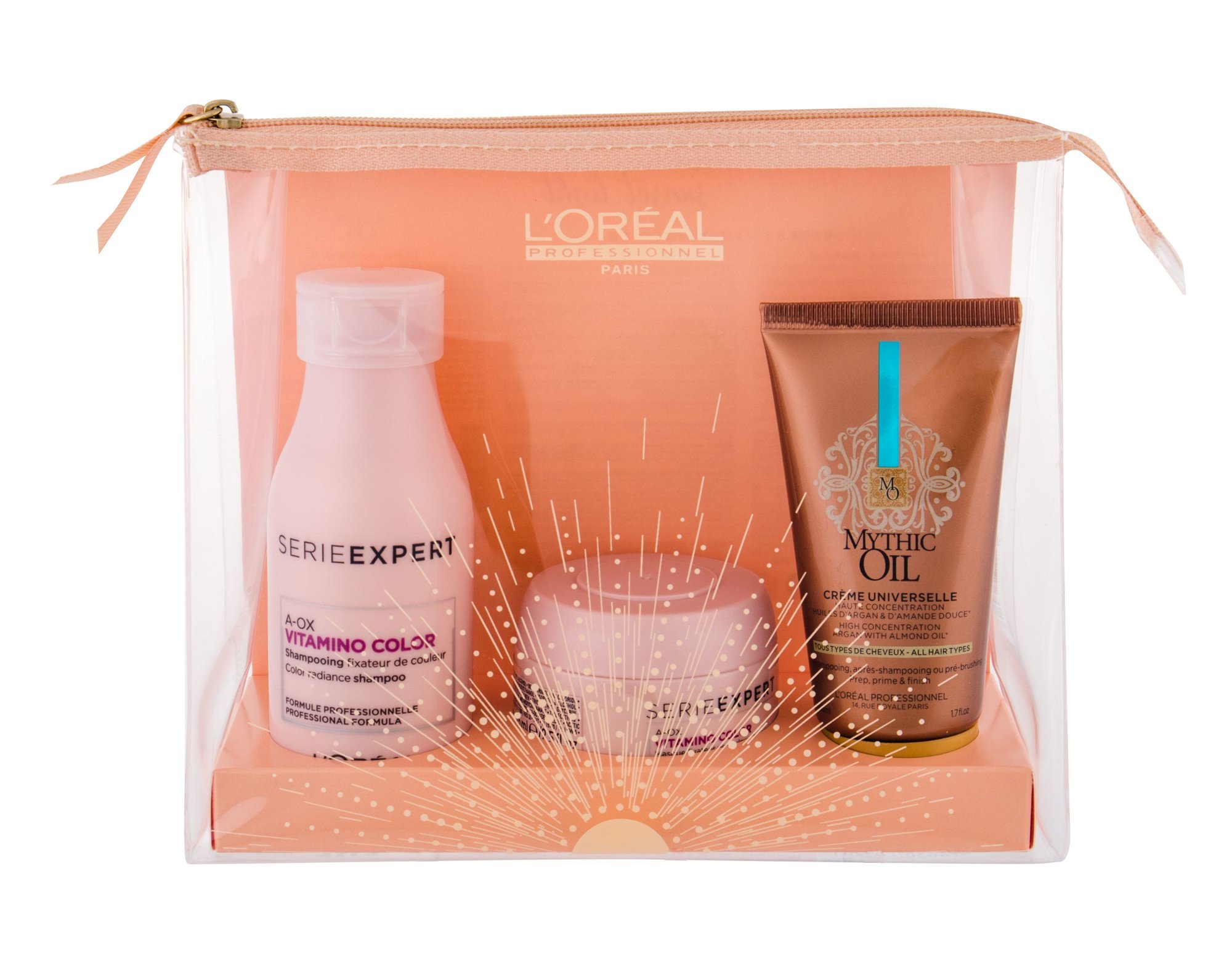 Dárková sada vlasové kosmetiky L´Oréal Professionnel Série Expert Vitamino Color A-OX pro péči o barvené vlasy. Co je součástí této sady?Šampon pro barvené vlasy L´Oréal Paris Expert Vitamino Color A-OX 100 ml.Šampon chrání barvu vlasů a zabraňuje jejímu vymývání. Bohaté složení s vitamíny...