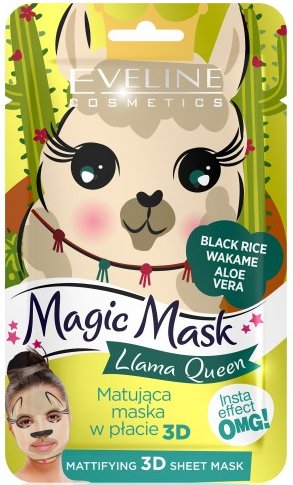 Textilní 3D pleťová maska Eveline Magic Mask Llama Queen Mattifying 3D Sheet Mask ideálně zmatní pleť, vyhlazuje a odstraňuje černé tečky.