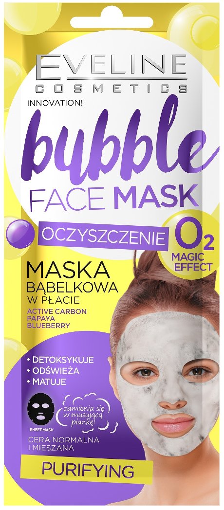 Čistící bublinková maska Eveline Purifying Bubble Face Mask obohacená aktivním uhlím, kyselinou hyaluronovou, výtažky z papáji, borůvek, pomerančů a citronů, dokonale odstraňuje nečistoty, jemně odlupuje, detoxikuje a matuje, zanechává pokožku svěží a zářivou.