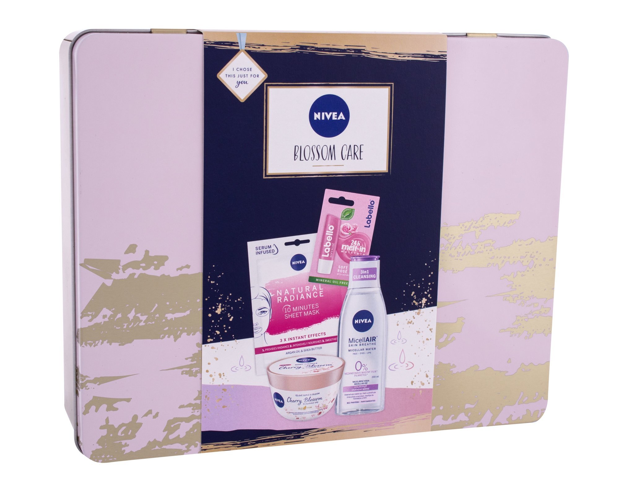 Nivea Blossom Care tělové suflé Body Soufflé Cherry Blossom & Jojoba Oil 200 ml + micelární voda MicellAir 200 ml + pleťová textilní maska Urban Skin Natural Radiance 1 ks + balzám na rty Labello 4,8 g Soft Rosé + plechová krabička