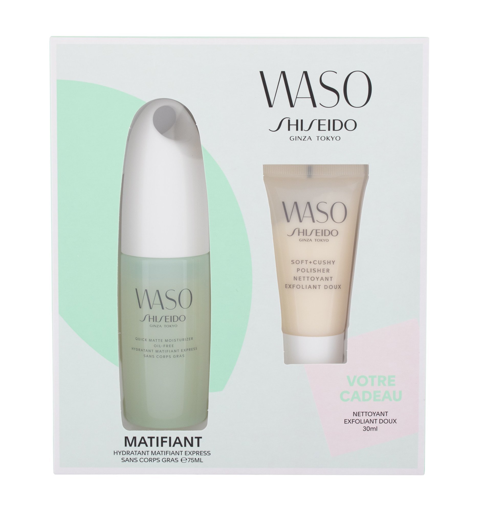 Shiseido Waso hydratační emulze Waso Quick Matte Moisturizer Oil-Free 75 ml + pleťový peeling Waso Soft+Cushy Polisher 30 ml + pleťová maska Waso Sleeping Mask 1,5 ml