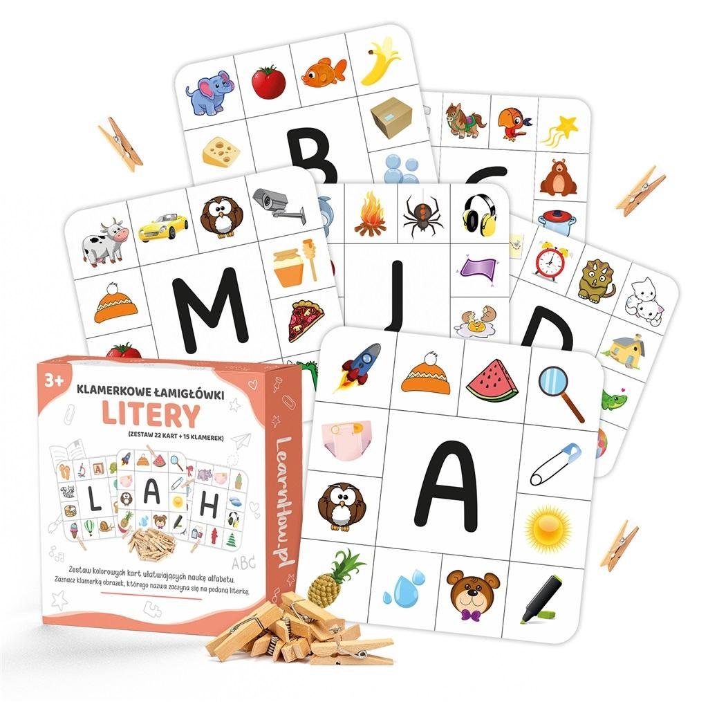 Zestaw składa się z 22 kart oraz 15 klamerek.Zadanie polega na oznaczaniu przy pomocy klamerek tylko tych rzeczy, których nazwa zaczyna się na literę umieszczoną w środku karty.Na kartach znajdują się następujące literki: A, B, C, D, E, F, G, H, I, J, K, L, M, N, O, P, R, S, T, U, W, Z.Karty o...