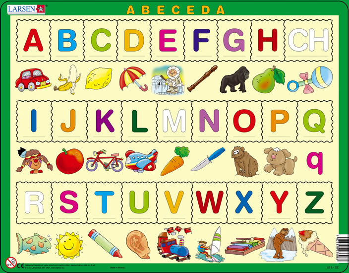 V pevném rámečku je 27 obrázků a na každém je 1 písmeno.Dílek s A se hodí a jde vložit pouze nad obrázek s autíčkem a tak dále. Česká abeceda a ke každému písmenu přiřazen obrázek začínající tím písmenem prečítať celé
