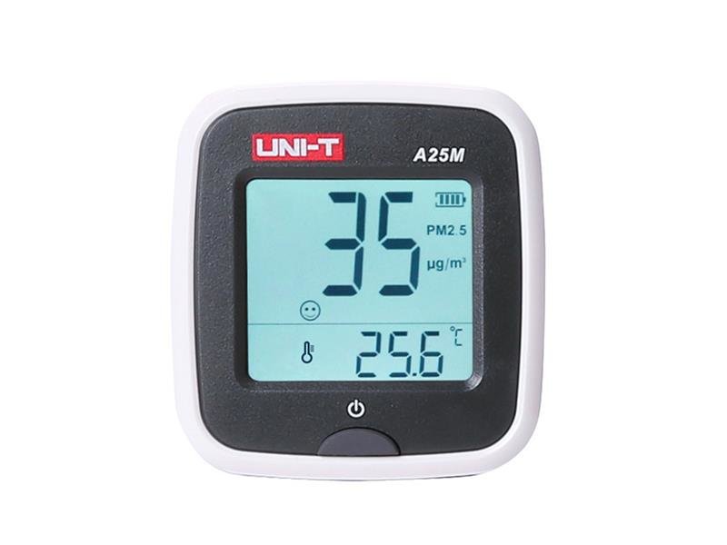 A25M je přenosný měřič částic PM2,5, který lze použít v domácnostech, kancelářích, vozidlech, laboratořích, kancelářích, hotelech, školách, továrnách, konferenčních místnostech, na letištích, v nemocnicích, restauracích, nákupních centrech a na mnoha dalších veřejných místech. Měří koncentraci těchto částic v mikrogramech na metr krychlový. Na podsvíceném dipleji LCD zobrazuje tuto koncentraci v μg/m³ a také v šesti úrovních pomocí emotikonů. Krátkým stisknutím tlačítka vypínače můžete zapnout nebo vypnout bílé podsvícení displeje. Ve výchozím nastavení je podsvícení automaticky zapnuto při zapnutí přístroje. Překročí-li koncentrace částic standard (PM 2,5 > 115μg/m³),