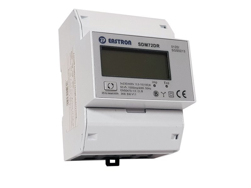Elektroměr 3F na DIN lištu třífázový VCX EASTRON SDM72 DR, MID, digitální, RESETElektroměr měří aktuální spotřebu energie (watty) a spotřebovanou elektrickou energii (kilowatthodiny - kWh). Zařízení udává množství elektřiny spotřebované spotřebiči v domě. Vybavený možností aktivního vynulování -...