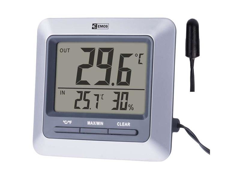 Teploměr EMOS E8860 Digitální teploměr s drátovým čidlem (3 m). Teploměr zaznamenává vnitřní a venkovní teplotu, vnitřní vlhkost, min. a max. teplotu. Parametry produktu: - externí drátová sonda- možnost nastavení jednotky teploty °C/°F- možnost pověšení na zeď-...