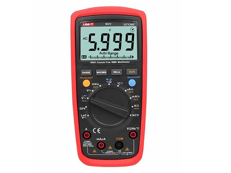 UT139E je nový profesionální multimetr s klasifikací True RMS a ochranou CAT III 600V, navržen pro potřeby elektrikářů pro měření distribučních sítí nn v budovách. Přístroj splňuje certifikaci cETLus a obsahuje řadu nadstandardních funkcí, jakými jsou např. měření napětí s nízkou impedancí (LoZ), bezkontaktní měření napětí (NCV), měření kapacity kondenzátorů, nebo také měření teploty. Přehledný displej se simulací analogového řádku s 31 segmenty zaručuje dokonalejší zobrazení naměřených hodnot a lepší vizuální reprezentaci. Údaje na displeji jsou tmavé na světlém pozadí, na rozdíl od přístroje UT139S, u kterého jsou světlé údaje na tmavém pozadí, jinak jsou tyto dva přístroje naprosto stejné. Rozsah zobrazení displeje je ± 9,999 pro měření kapacit a frekvencí a pro ostatní měření ±5,999. Obnovovací frekvence 2 až 3 krát za vteřinu. Jištění proudových rozsahů je provedeno trubičkovými tavnými pojistkami (rozsah 10A pojistkou FF 10A H/600V (6 x 25mm); rozsah mA/µA pojistkou FF 600mA H/600V (6 x 32mm)). Napájení multimetru je provedeno dvěma alkalickými bateriemi AA 1,5V.Rozsah měření veličin lze volit automaticky, i manuálně. Součástí balení jsou měřící kabely s hroty, termo sonda s článkem typu K a také baterie.