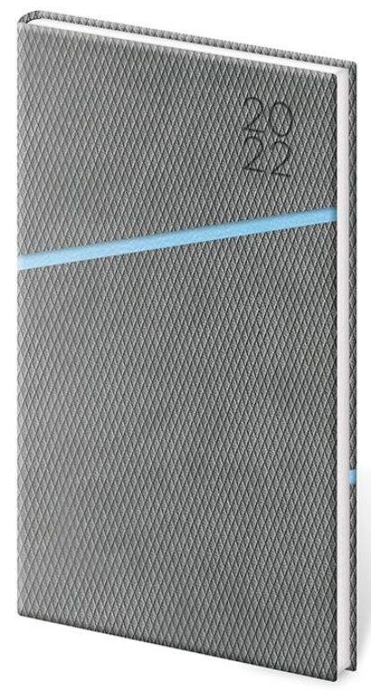 Desky diáře Grife jsou vyrobeny převážně z šedé matné a strukturované koženky. Šedá koženka je ozdobena barevným pruhem.