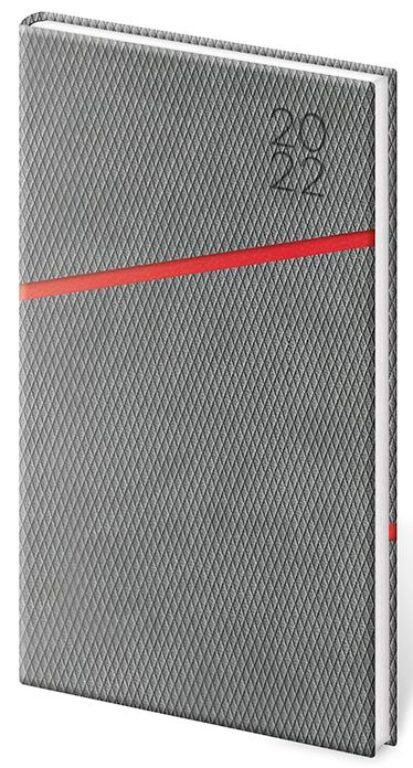 Desky diáře Grife jsou vyrobeny převážně z šedé matné a strukturované koženky. Šedá koženka je ozdobena barevným pruhem.