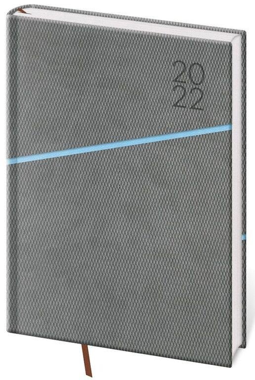 Desky diáře Grife jsou vyrobeny převážně z šedé matné a strukturované koženky. Šedá koženka je ozdobena barevným pruhem.