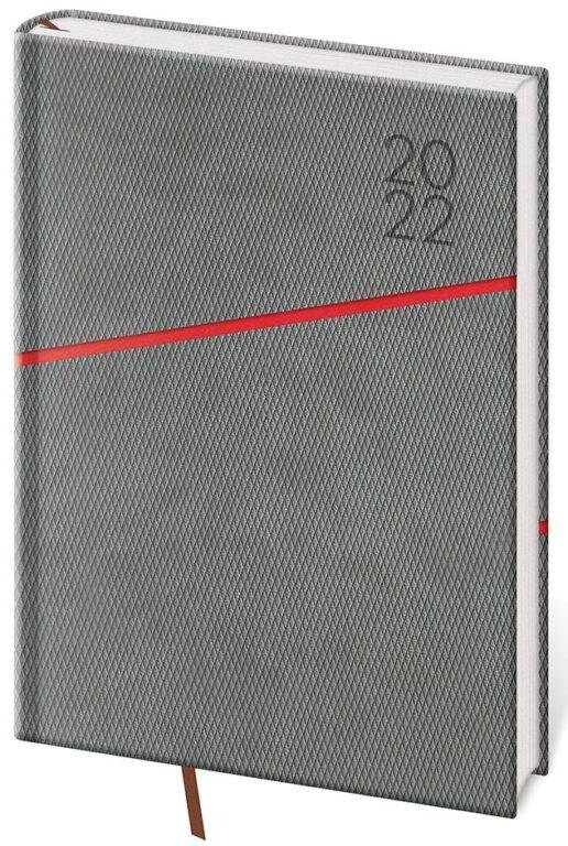 Desky diáře Grife jsou vyrobeny převážně z šedé matné a strukturované koženky. Šedá koženka je ozdobena barevným pruhem.