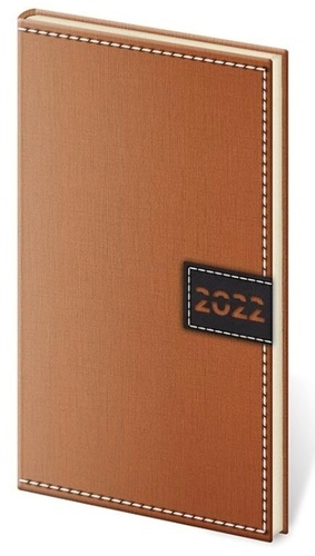 Diář je vyroben z koženky s pravidelnou vroubkovanou strukturou. Jeho okraj zdobí obšití nití, letopočet je netradičně vyseknut do kontrastního materiálu.