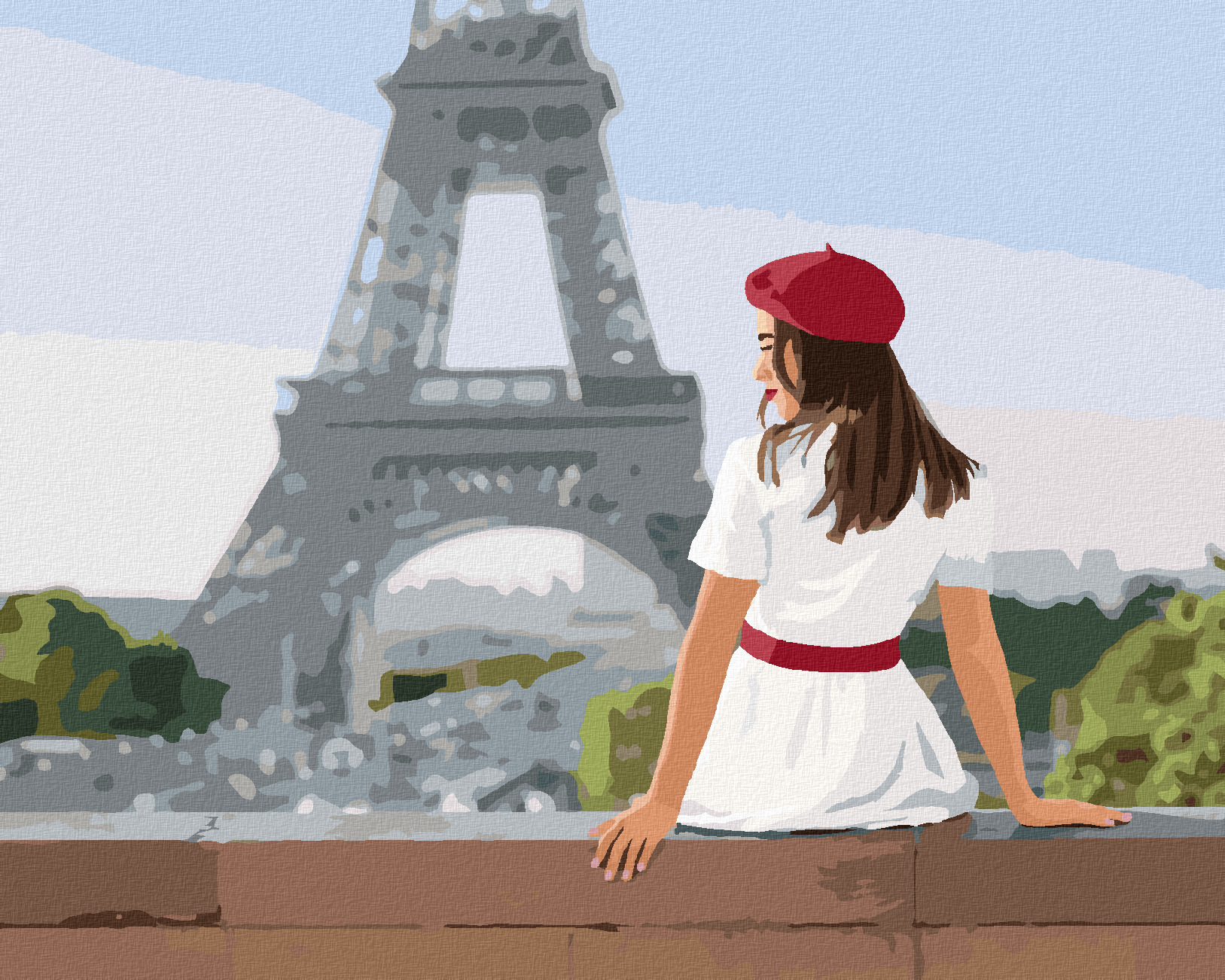 Malování podle čísel - ŽENA V BÍLÝ ŠATECH A EIFFELOVA VĚŽ - 40x50 cm, bez rámu a bez vypnutí plátna