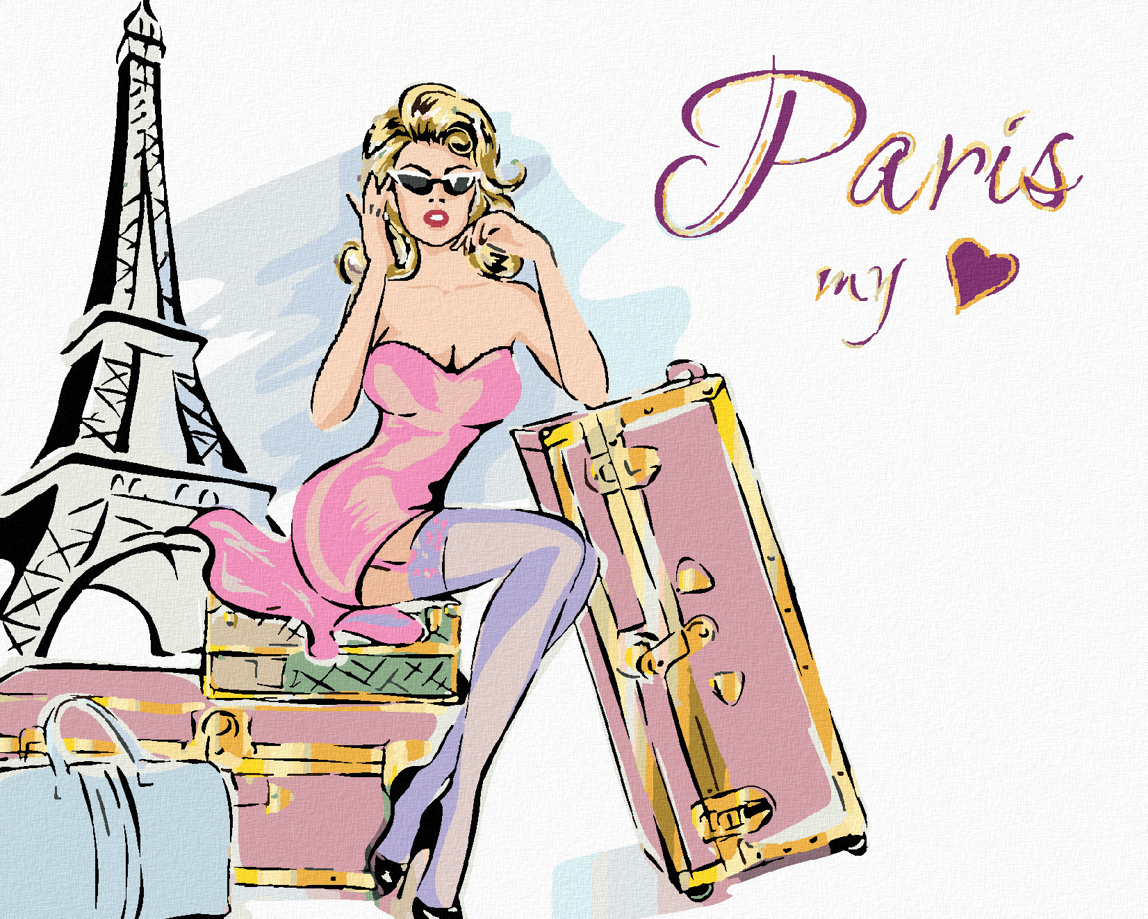 Malování podle čísel - ŽENA S KUFRY U EIFFELOVY VĚŽE - 80x100 cm, bez rámu a bez vypnutí plátna