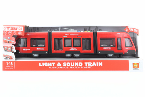 Plastová tramvaj na baterie. Tramvaj vydává zvuky a svítí. Rozměry cca 44,5 x 5,8 x 12 cm. Napájení na 3 AG13 baterie (jsou součástí). Rozměry balení cca 48 x 11 x 16,5 cm. Věk 3+ prečítať celé