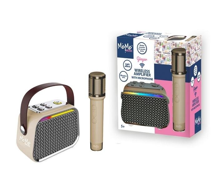 Przenośny mikrofon z głośnikiem i funkcją karaoke. Posiada funkcję usuwania wokalu z ulubionych utworów. Możliwość włączenia różnych efektów świetlnych. Funkcja zmiany głosu. Możliwość regulacji głośności dźwięku. Do ładowania służy znajdujący się w zestawie kabel USB-C. Mikrofon w środku posiada baterię litową.