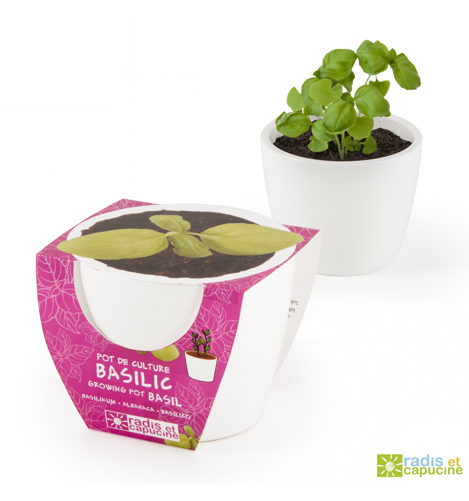 Mini zahrádka - Mini květináč Ceramic s bazalkouVytvořte si doma vlastní mini zahrádku! Produkty Radis et Capucine jsou ideálním způsobem, jak nejen dětem přiblížit záhady růstu a pěstování plodících rostlin a bylinek. Pro vypěstování je k dispozici stlačený instantní substrát s kokosovými vlákny...