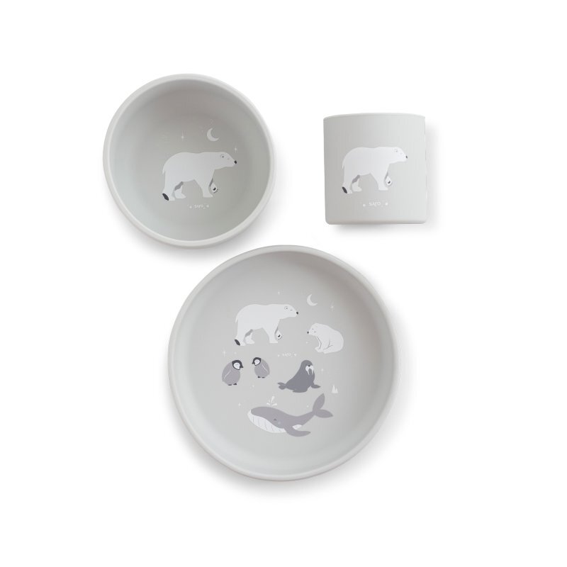 celosilikonová jídelní sada - miska + talíř + hrníčekperfektní pro první samostatné jezení - posiluje sebevědomí a podporuje nezávislost děťátkamiska a talířek mají vyvýšené okrajesnadno se drží i těm nejmenším ručičkámvyrobeno z prémiového potravinářského silikonuantibakteriálnívelmi flexibilní...