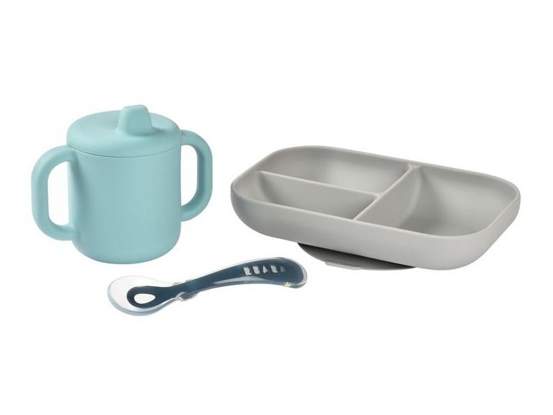 Sada děleného talíře, hrnku na pití a lžičky z vysoce kvalitního silikonu je ideální pro první samostatné krmení. Přísavka u talíře umožňuje uchycení ke stolu nebo pultu jídelní židličky. Ergonomický tvar s vysokými okraji usnadňuje nabírání příkrmu. Tři přihrádky umožňují oddělené servírování...