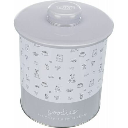 doplňkové krmivo v uzavíratelné kovové dóze s pěkným grafickým motivem malé a měkké pamlsky pro psy s kuřecím masem bez cukru praktický doplněk do domácnosti usnadňující péči o psa rozměry: ø 14 × 17 cm hmotnost: 1 kg barva: šedá/bílá složení: obiloviny, vedlejší rostlinné produkty, maso a...