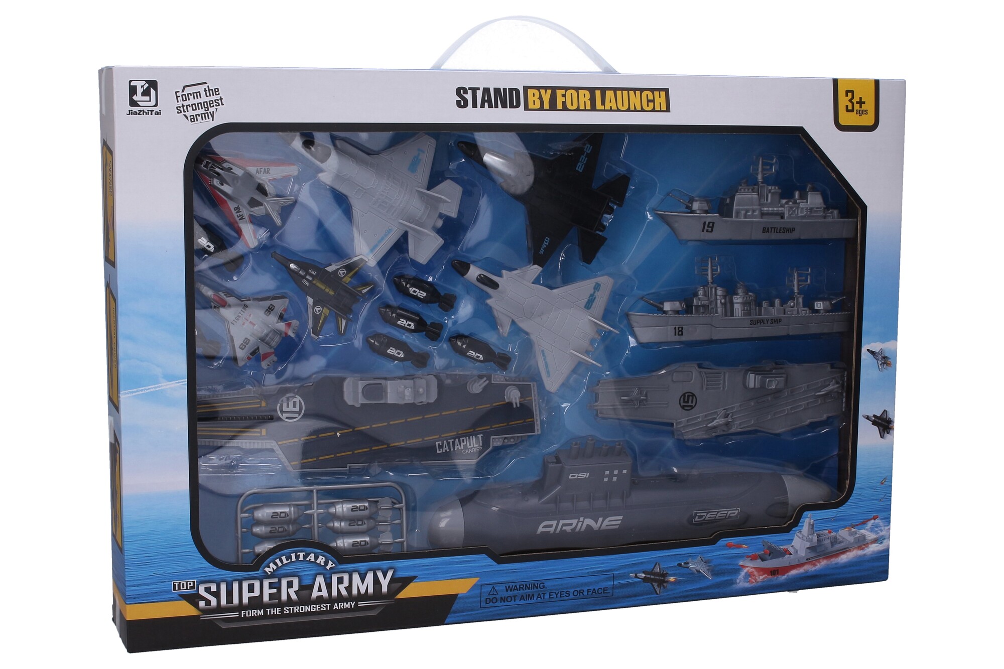 Letadlová loď s katapultem 25 cm set s ponorkou. Obsah balení - letadlová loď na setrvačník s katapultem na stíhačky 25 cm, ponorka s vystřelováním torpéd 28 cm na setrvačník, letadlová loď 18 cm, bitevní loď 16 cm, bitevní křižník 14 cm, 3 stíhačka volná kola 12 cm, 3x stíhačka katapultovací 7...
