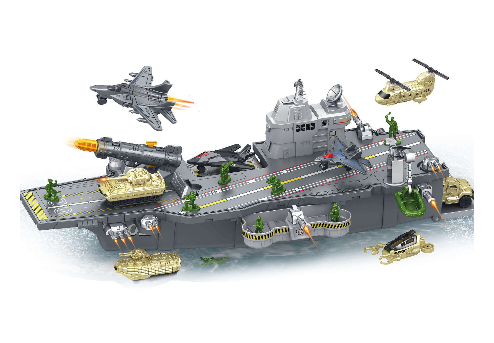 Letadlová loď s vozidly a vojáky set. Rozměry 47,5x21x14,5 cm. Návod na sestavení na obalu. Manuální pohyblivé prvky bez efektů. prečítať celé