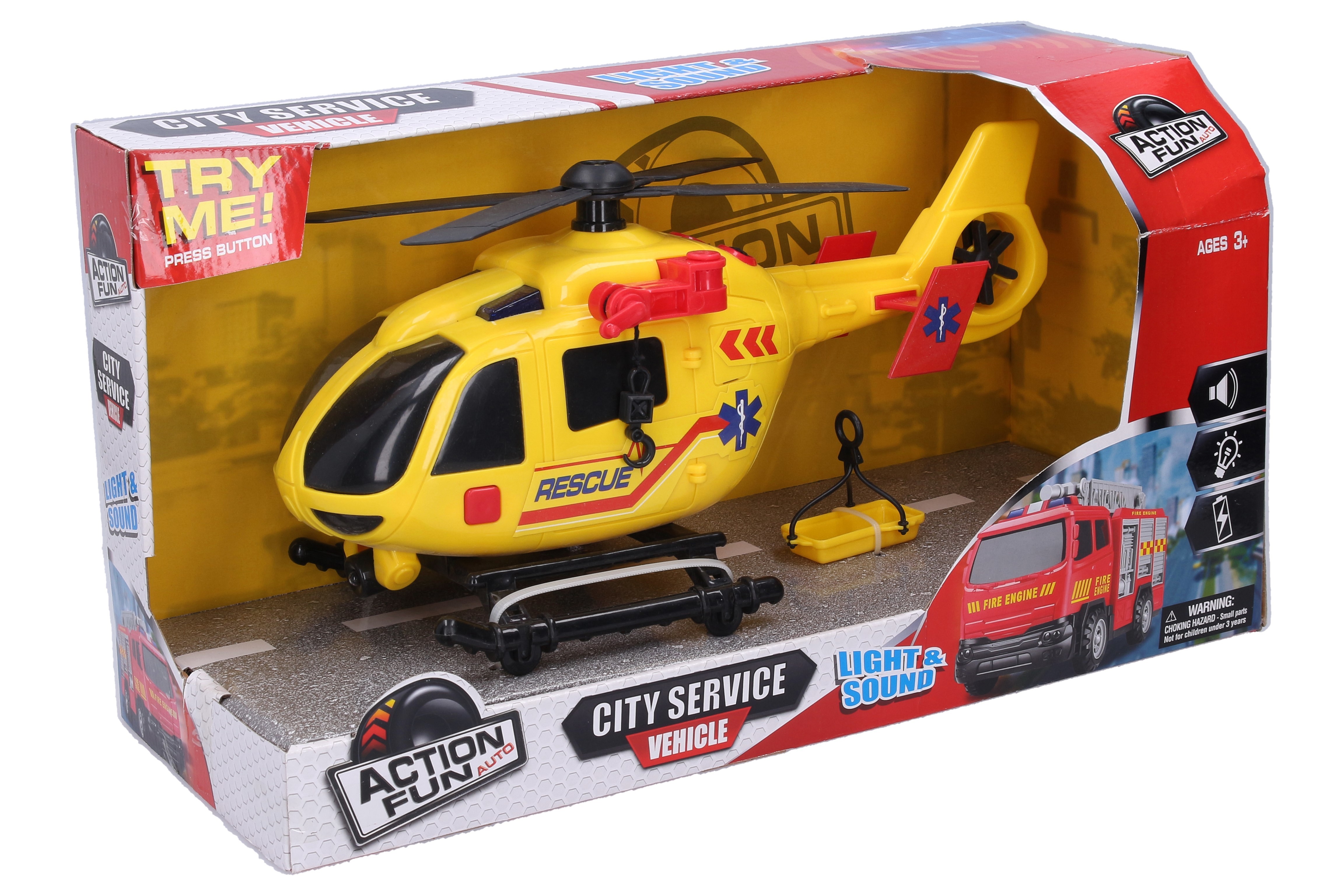 Vrtulník záchranáři s navijákem. Velikost 31 cm. Vrtulník má naviják na kličku a zvedací nosítka. Světelné a zvukové efekty, aktivace tlačítkem na straně.