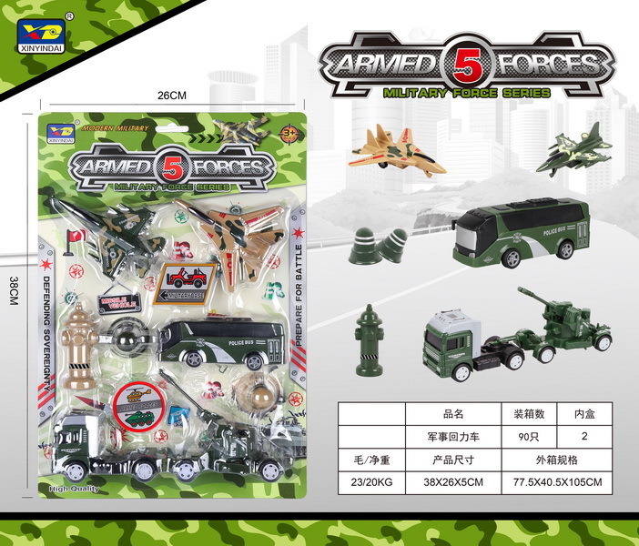 Vojenský set. Na zpětné natažení. Součástí 2 stíhačky, autobus, tahač s dělem, hydrant, 2 kužely. prečítať celé
