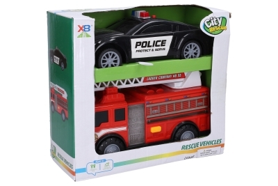 Auta policejní a hasičské s efekty. Velikost 23 cm. Volná kola. Světelné a zvukové efekty tlačítkem na střeše policejního auta a tlačítkem na levém boku hasičského auta. 2xAG13 baterie pro každé auto součástí. prečítať celé