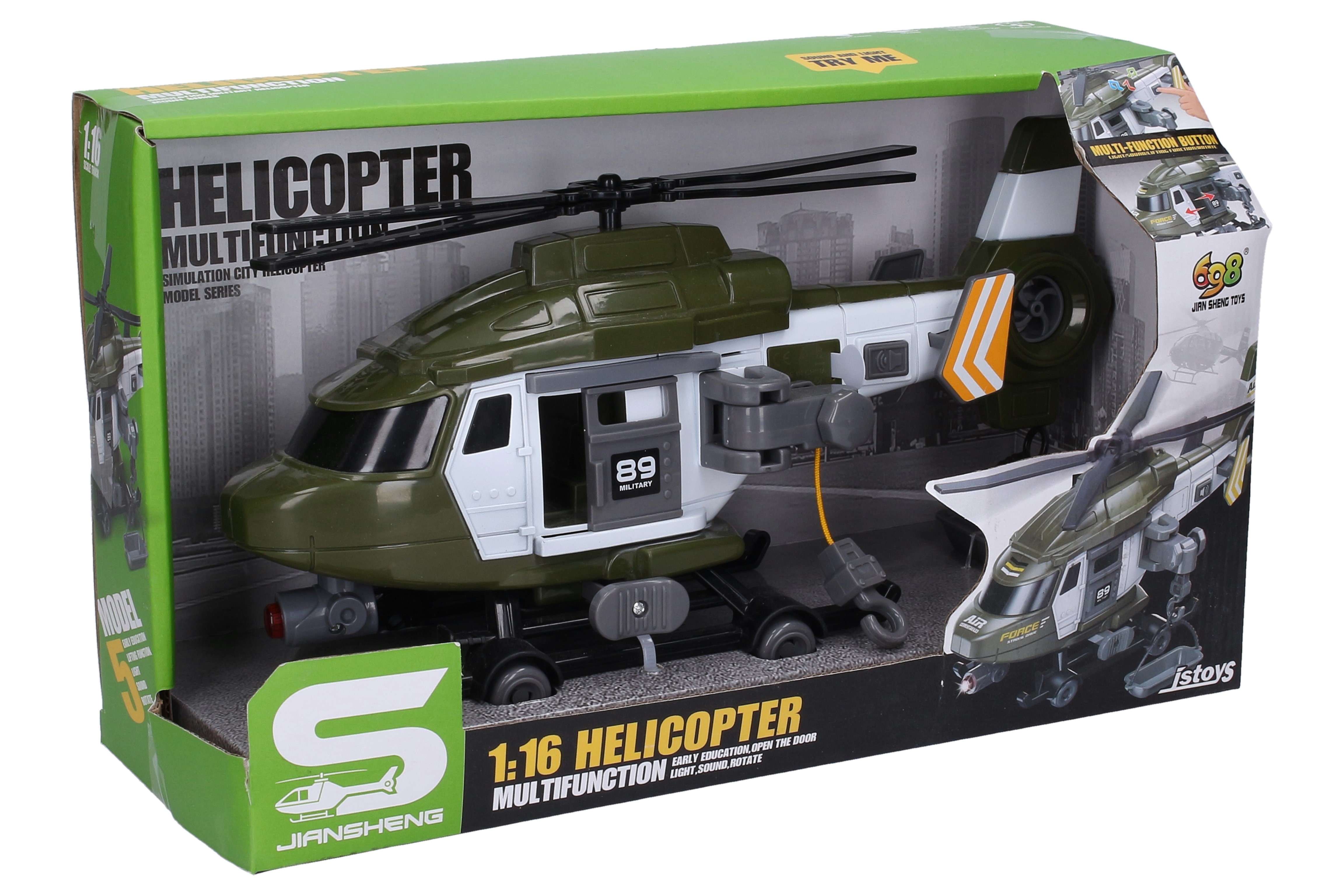 Vrtulník vojenský s efekty. Rozměry 29x9,5x14 cm. Světelné a zvukové efekty tlačítkem na křídle. 3xAG13 baterie součástí. Stlačením páčky pod dveřmi se otáčí hlavní vrtule. Kolečkem na konci křídla se otáčí vrtule v křídle. Manuální navíjecí hák. prečítať celé