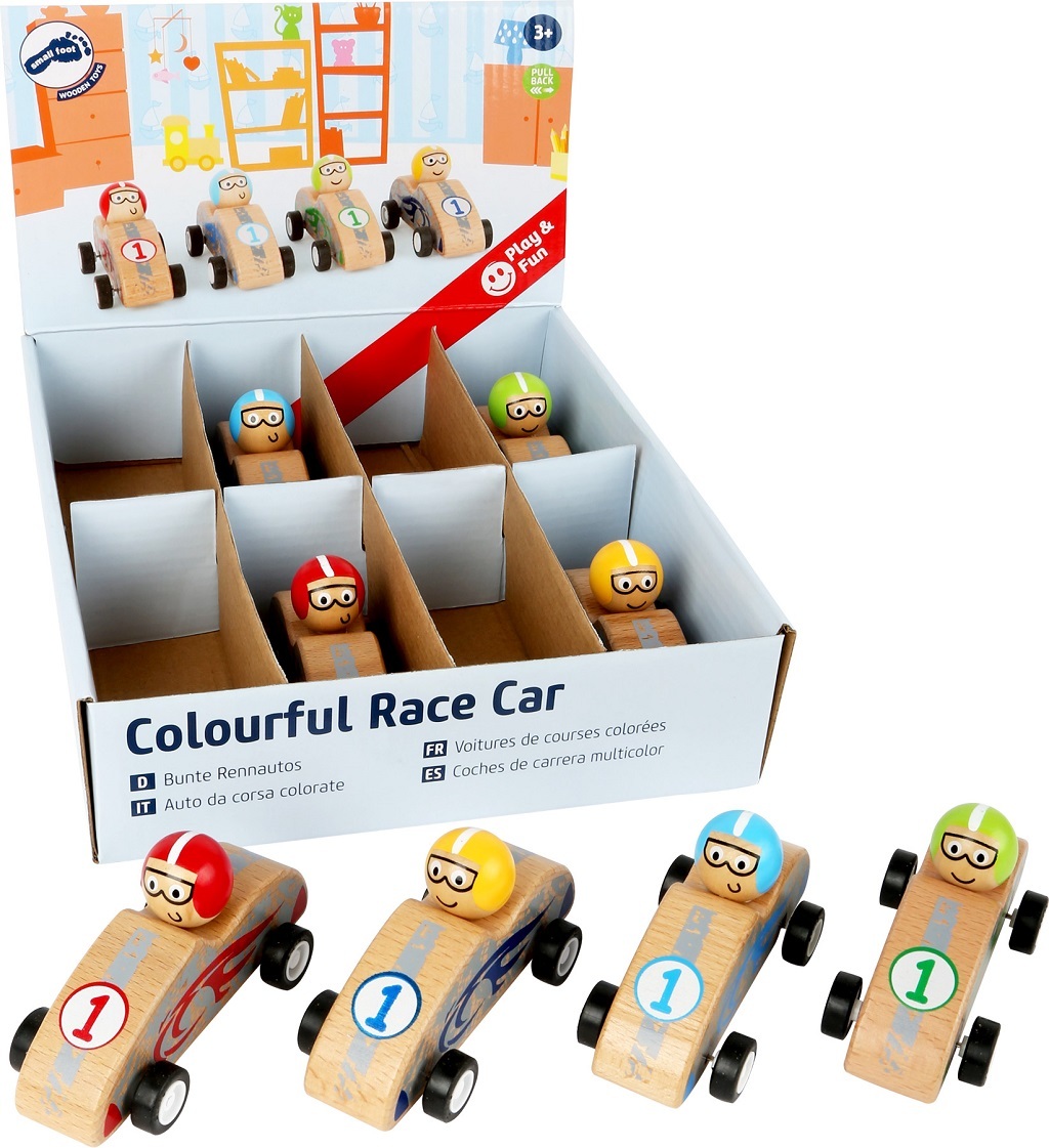 Small Foot Displej závodní auto na setrvačník 8 ks Tato barevná závodní auta vyrobená z glazurovaného dřeva a jejich roztomilí řidiči nejenže vypadají skvěle, ale také zajišťují spoustu zábavy. Setrvačník zajistí dostatečnou rychlost na závodišti. Nadchne lidi všech věkových skupin. Německá...