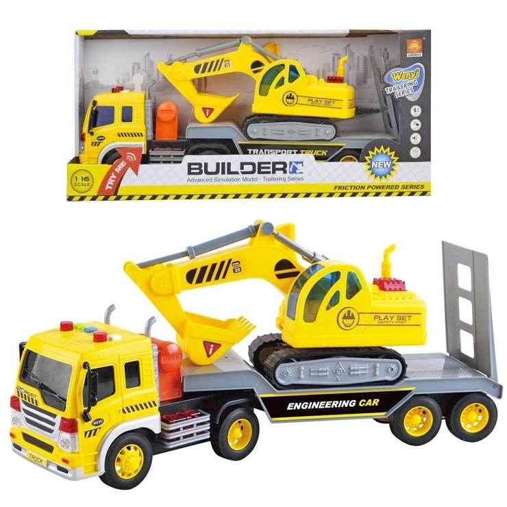 Odtahovka s bagrem. Po vytažení baterkové pojistky a stisku tlačítek, auto vydává reálné zvuky - startování, troubení a couvání. Bagr se manuálně ovládá pákou na boku stroje. Hračka vyžaduje 3ks baterií typu AG13, které jsou součástí balení. Nevhodné pro děti do 3 let.Délka auta: 38cm