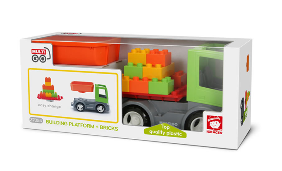 Igráček MuliGO je nově k dostání v praktickém a ekonomicky výhodném balení. Se sklopnou stavební plošinou můžeš převážet figurky zvířátek a postavit si vlastní korbičku ze své oblíbené stavebnice. Balení obsahuje auto, dvě korbičky pro snadnou výměnu a 9 stavebních kostek kompatibilních např. s LEGO® DUPLO® nebo MEGA BLOKS®. Vyrobeno v České republice.