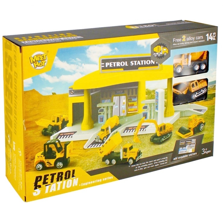 Mega parkovací dům Pracovní stroje . Parkoviště má vjezdovou bránu pro auta, semafor pro usnadnění pohybu po parkovišti. Obsah soupravy: parkoviště, čerpací stanice, doplňky jako semafory, dopravní značky, 2x stavební vůz. Vše je vyrobeno z plastu a kovu.